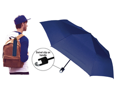 42" arc, manual opening personal umbrella with clip on handle easily clips on backpack or briefcase for travel on rainy days. Great for students or commuters. Folds to a convenient 9"